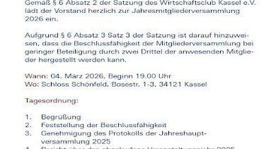Gemäß § 6 Absatz 2 der Satzung des Wirtschaftsclub Kassel e.V. lädt der Vorstand herzlich zur Jahresmitgliederversammlung 2026 ein.